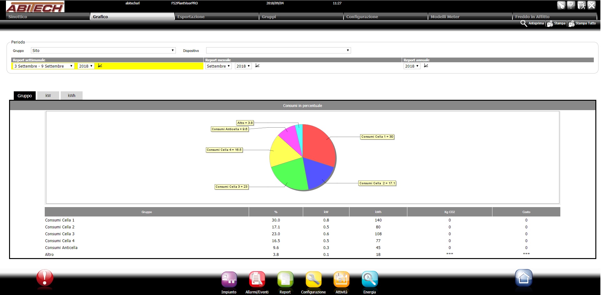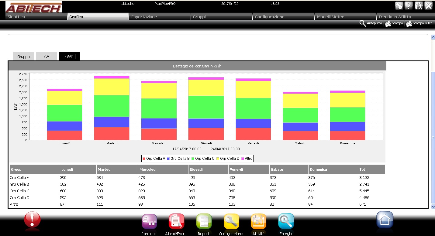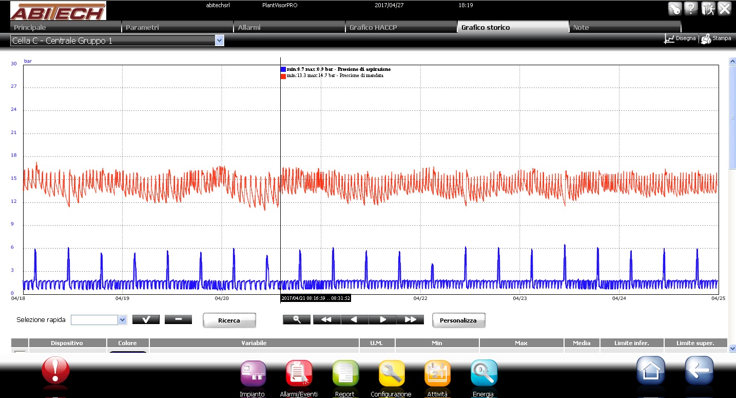 La telegestione elaborerà in automatico un grafico di temperatura, umidità, pressioni di lavoro e consumi elettrici come quelli nelle foto; da questi grafici è possibile dunque vedere, ad esempio, quale temperatura c'era in cella il giorno X alle ore Y.